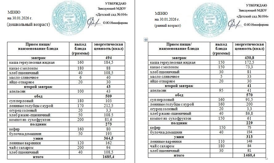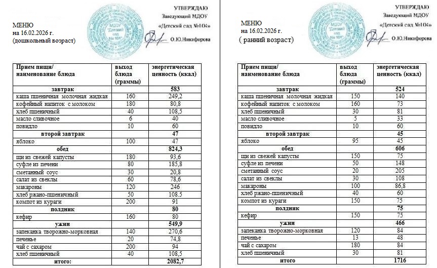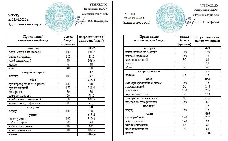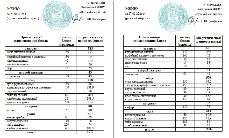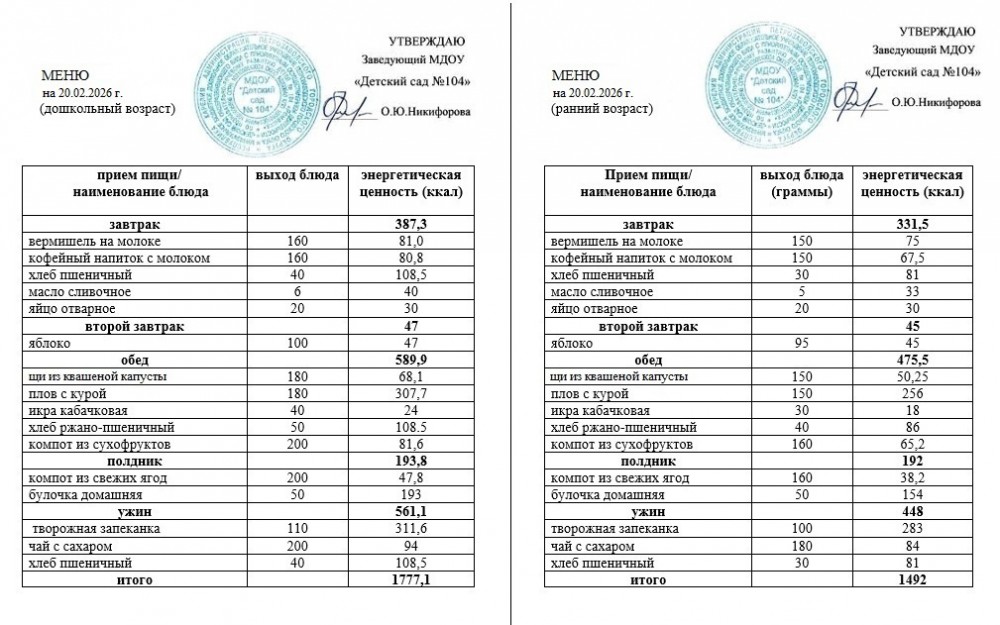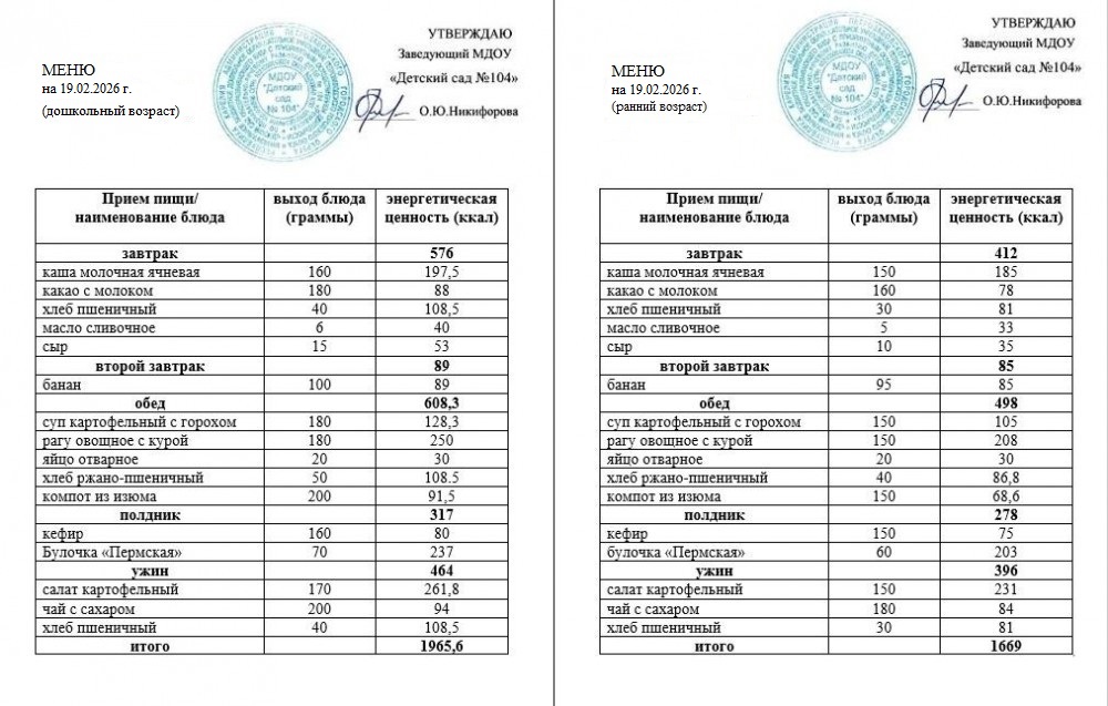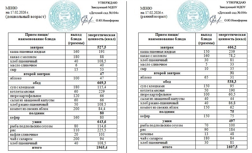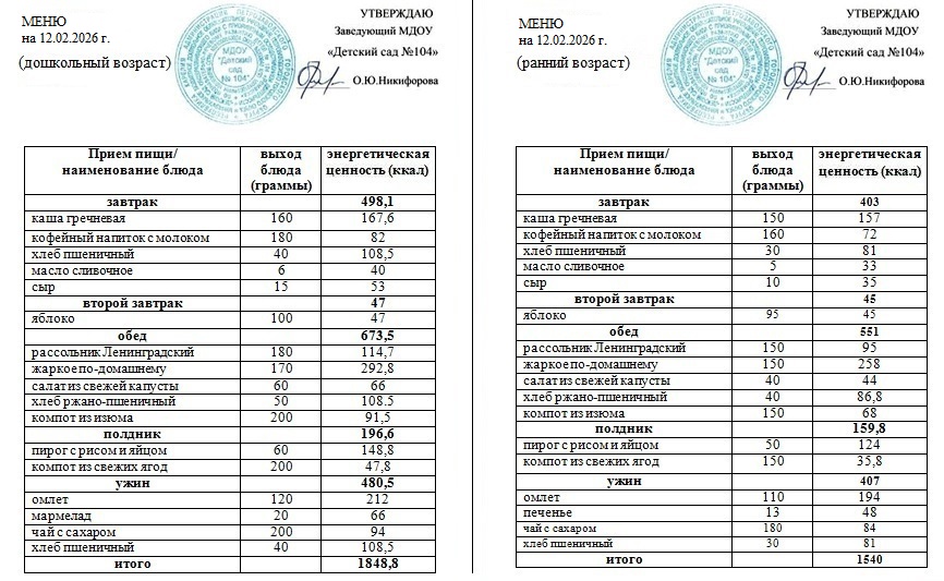 На основании примерного 10-ти дневного меню ежедневно составляется меню – требование установленного образца, с указанием выхода блюд для детей раннего и дошкольного возраста.