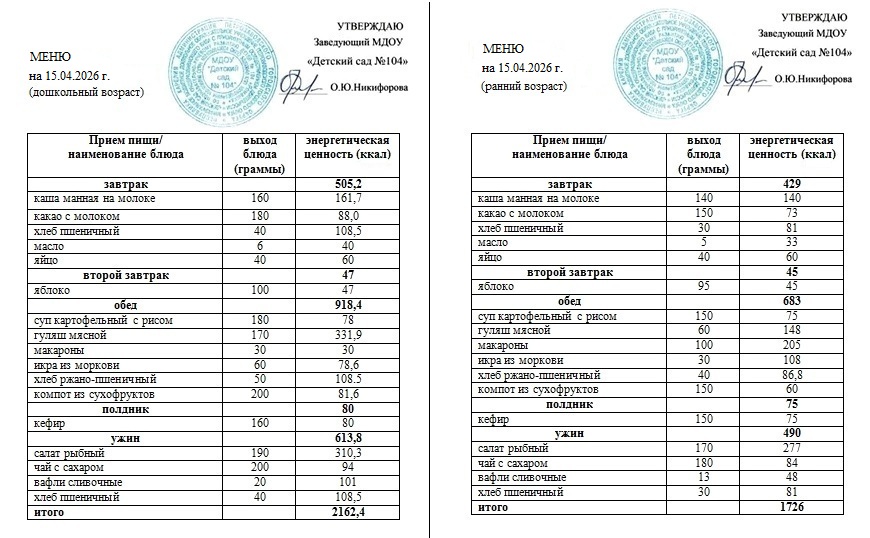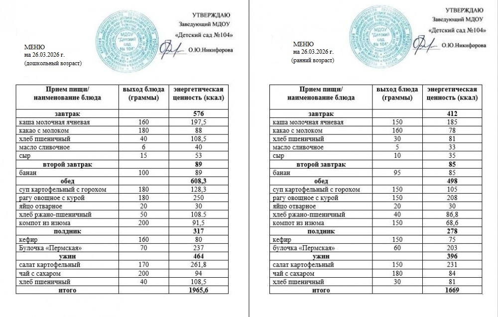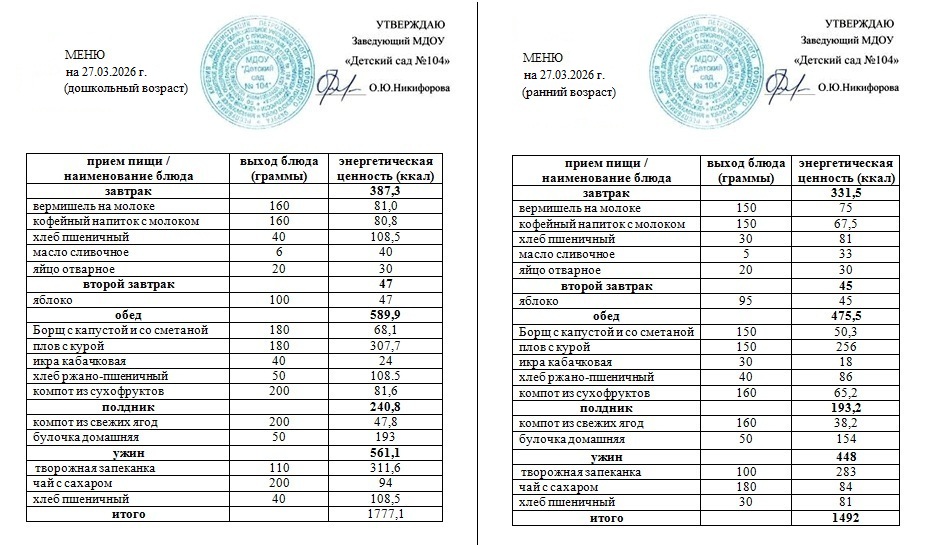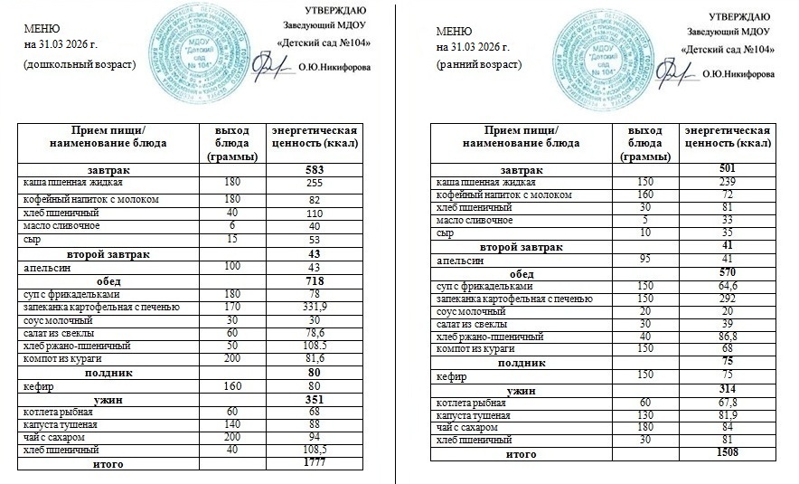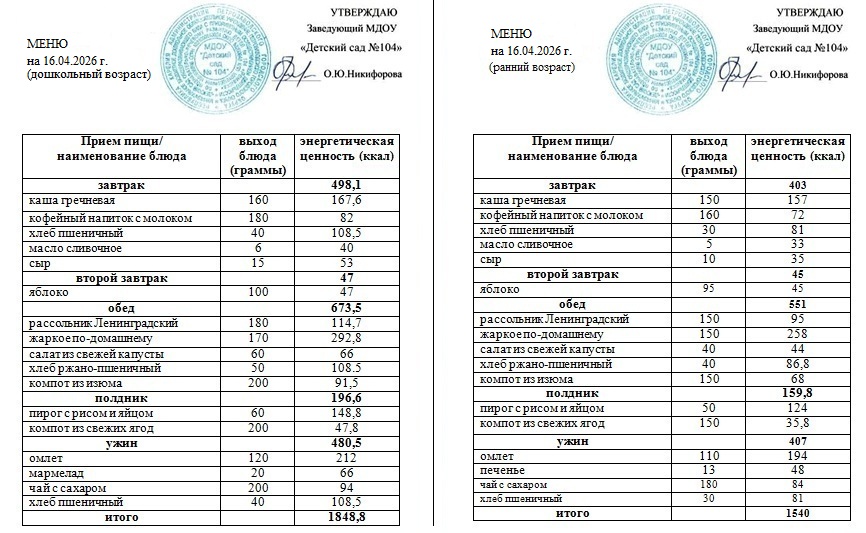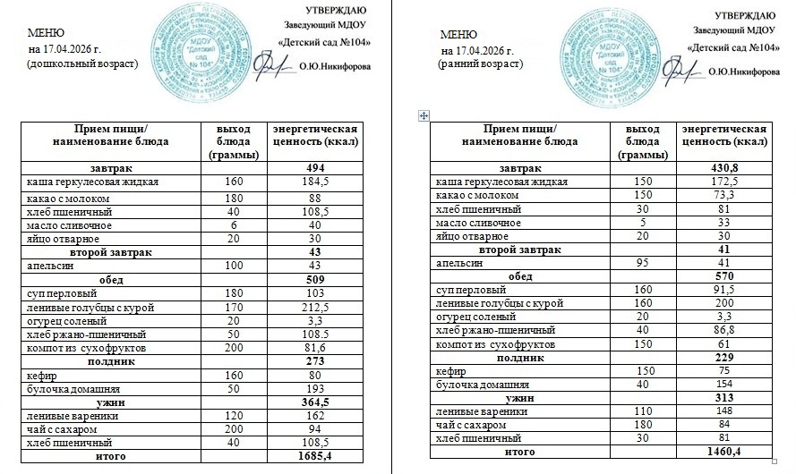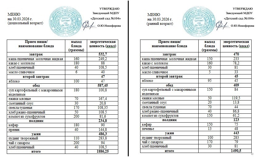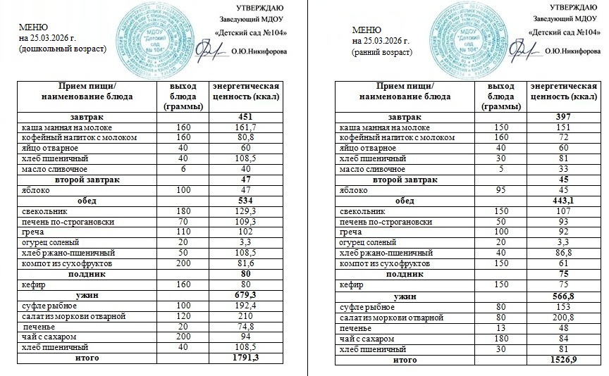 На основании примерного 10-ти дневного меню ежедневно составляется меню – требование установленного образца, с указанием выхода блюд для детей раннего и дошкольного возраста.